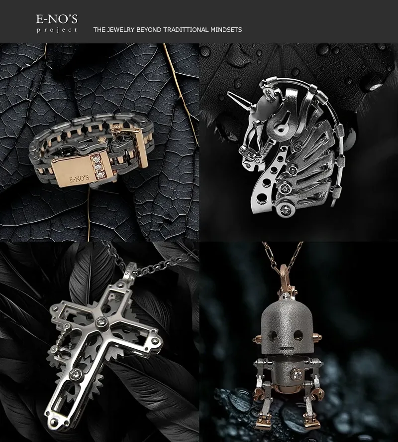 一点一点、ものづくりをするイーノスは、製造本数に限りがあり、本来ジュエリーが持つ希少性を重んじています。使用する素材は18金ホワイトゴールドやピングゴールドがメインで、その作品は芸術品のような美しさと存在感を放ちます。