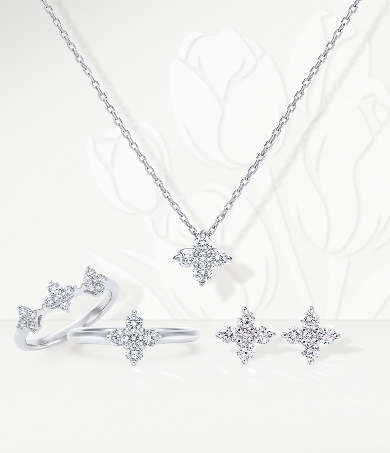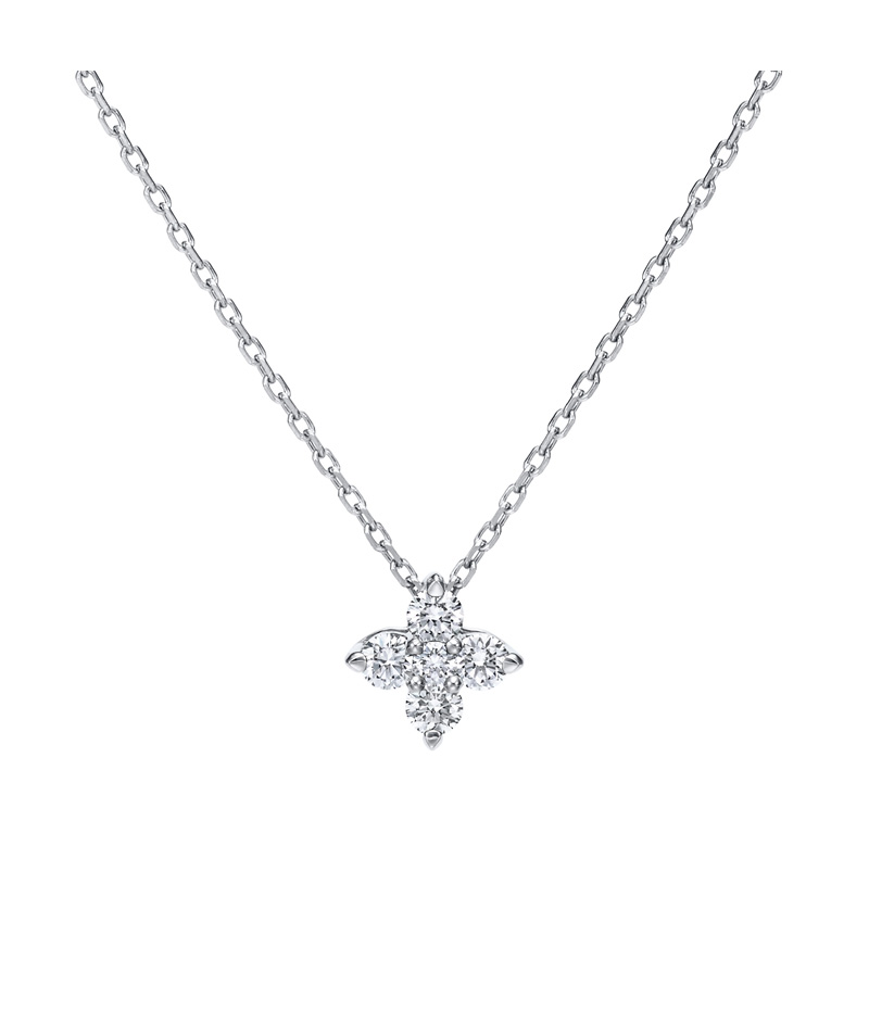 5つのダイヤモンドを花芯と花びらに見立てたこちらのデザインは、胸元で華やかな輝きを放ちます。