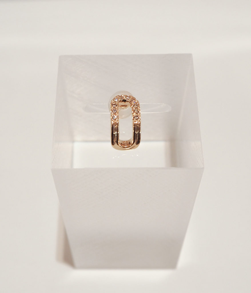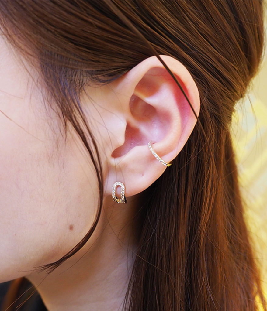 オブロングシェイプが耳たぶを包み込むようにフィットするハーフフープピアス。アールデコに着想を得たレトロモダンな曲線美を、ダイヤモンドのアーチでより印象的に。
