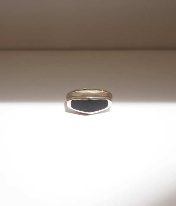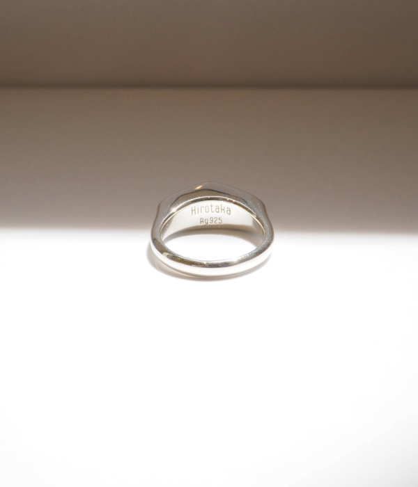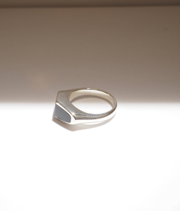 2つの角度が交わり、その延長線上にある光源を暗示する「ピラミッド」シリーズ。建築的な力強さとオーガニックな温もりの共存。滑らかなフェイスは、シルバーの土台と嵌め込んだ天然石を同時に磨き上げる職人技の結晶です。幅の狭いナロースタイルのリングは、さまざまなコーディネートのアクセントにも。