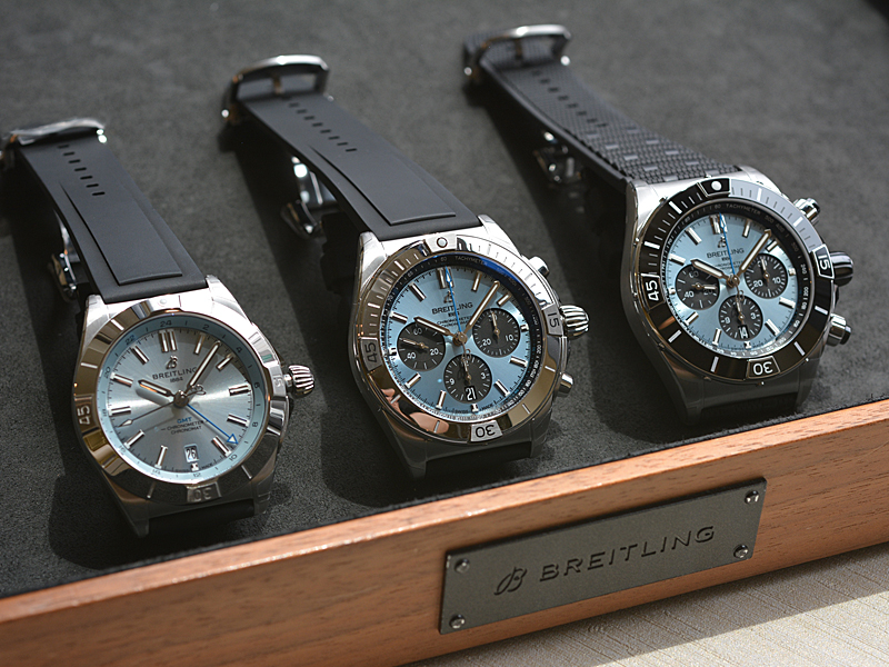 3本の共通点は、クロノマット・アイスブルーダイヤルだけでなくケース素材(ベゼル部分)にプラチナが使用されているという点も挙げられ、プラチナならではの、洗礼された美しい輝きをご堪能いただけます。