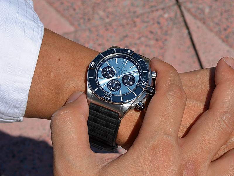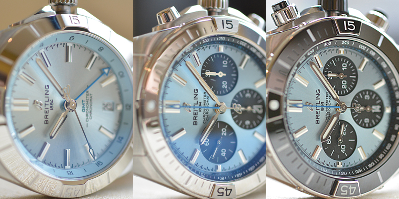 そしてブライトリングのアイスブルーカラーといえば、角度によってはシルバーカラーにも見える上品な色合いも魅力の一つです。