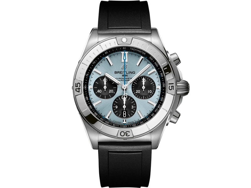 アイスブルー×プラチナという組み合わせが、クロノマットというブライトリングのアイコンの中でも一際特別な位置づけを感じさせます。