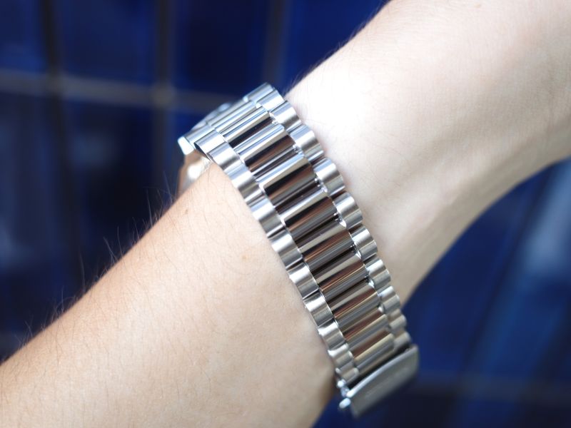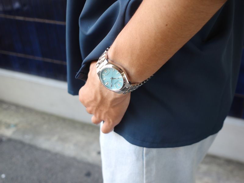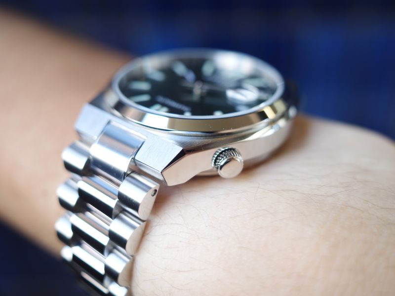 ラグも短くブレスレットがまっすぐ落ちてくれますので、腕なじみが良くしっかりと腕元にのってくれます。4時位置のリューズも着用時に邪魔にならず、ここも着用感に寄与してくれています。