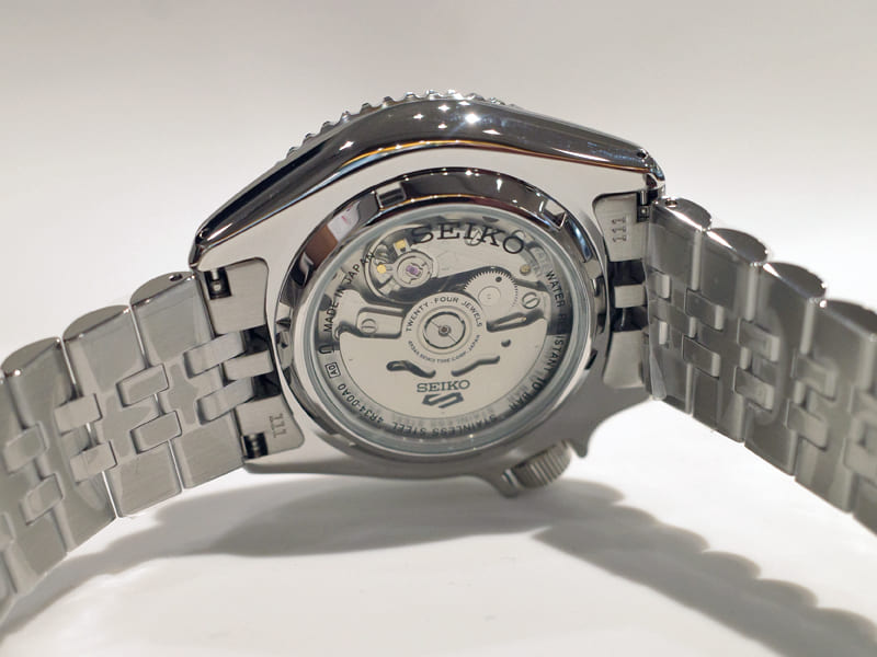 SBSC021は裏ぶた:ステンレス+ガラス仕様。自動巻キャリバー4R34のローターが回る様子を眺められ、メカ好きにはたまらないポイント。実用GMTに“観る愉しみ”も添えています。