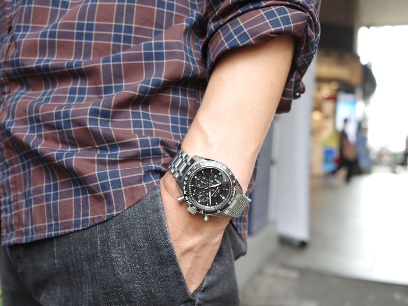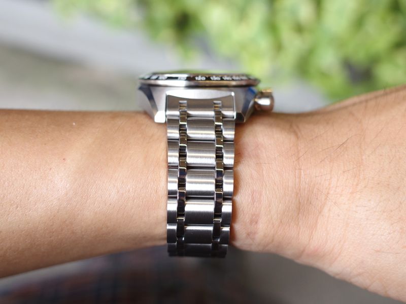 42㎜のケースに厚みが14.6㎜と、自動巻きクロノグラフの特性上、若干ケースに厚みがありますが、小さめのブレスコマと、短めのラグに重心を下げる様に取り付けられたブレスレットの工夫で装着感は良く腕なじみも良いです。