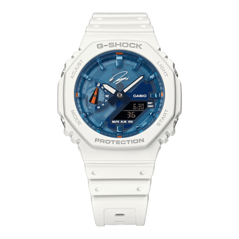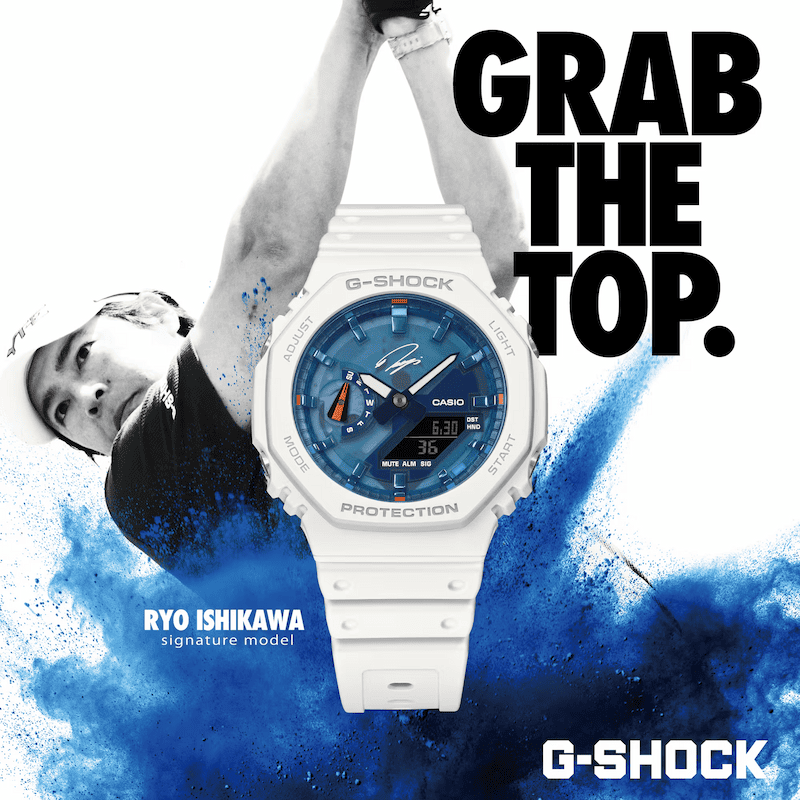 プロゴルファー石川遼選手シグネチャーモデル第5弾が登場。ベースは薄型のGA-2100。闘志を秘めたブルーと潔いホワイト、希望を象徴するオレンジが調和し、スケルトン文字板が爽やかな印象を演出します。