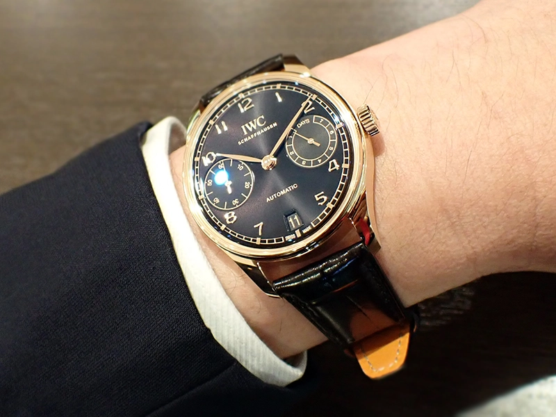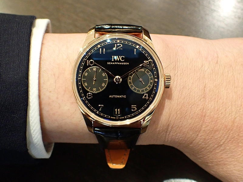 初代ポルトギーゼの伝統に則り、クラシックウォッチの中ではやや大きめのサイズ感も魅力の本作。良い意味で優等生的に納まらないところとでも申しましょうか、パワー系ビジネスマンのS様にぴったりですね。