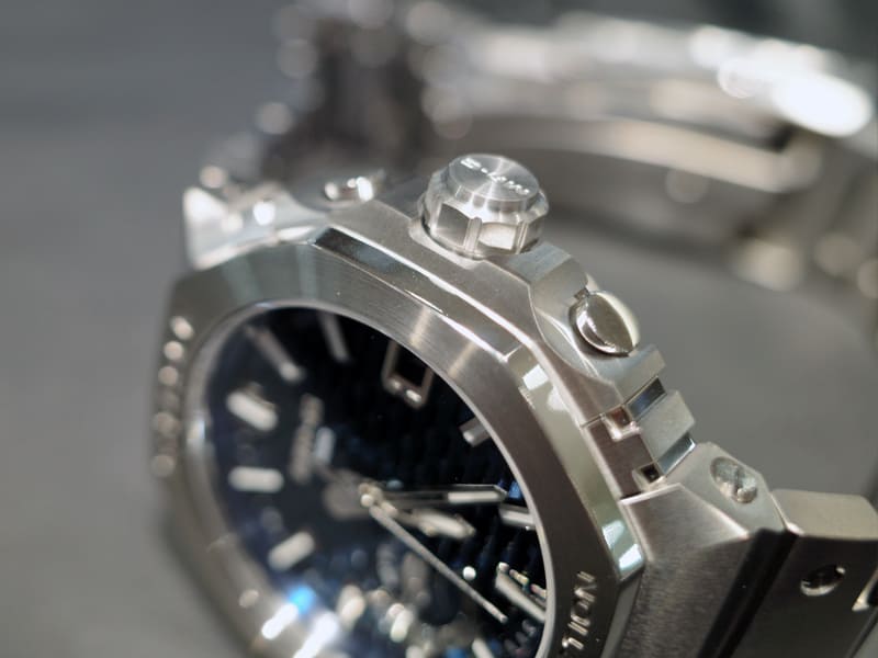 ケース・裏ぶた・ボタン・りゅうずには64チタンを採用し、強さと軽快さのバランスも抜かりありません。