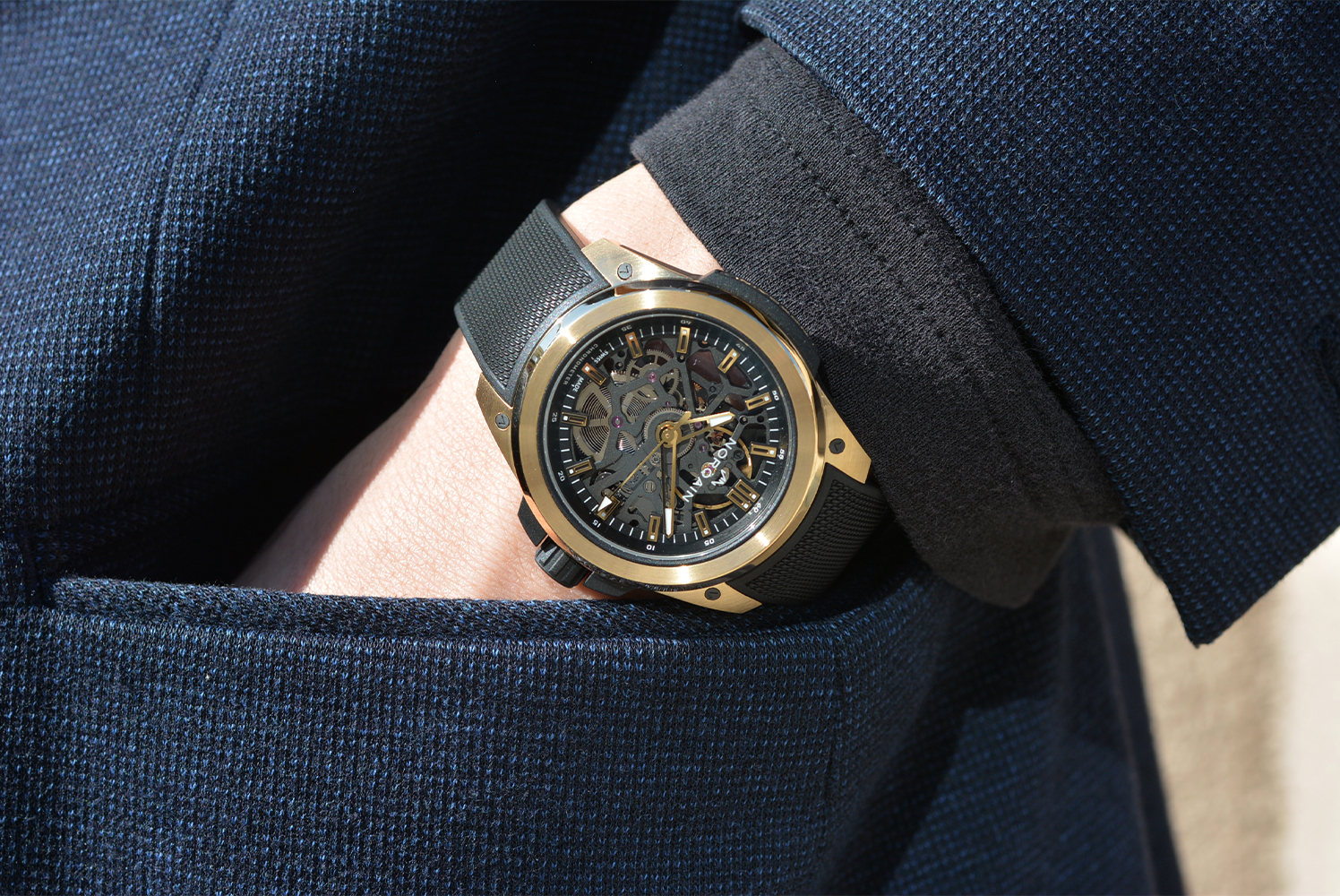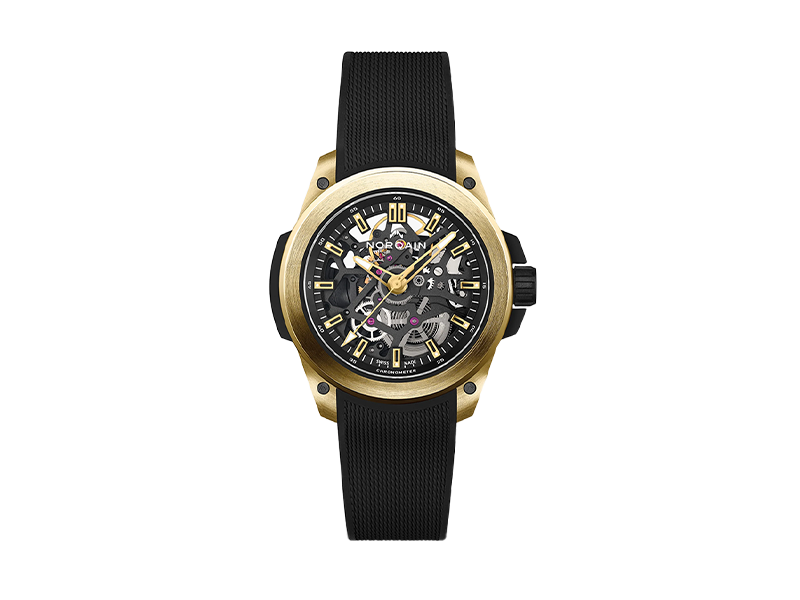 耐衝撃性の秘密はノルケイン独自の超軽量かつ超高耐久のカーボンファイバー素材であるNORTEQⓇです。このNORTEQⓇとイエローゴールドでラバー製のショックアブソーバーを包む様にケースを形成。この構造と素材のおかげで、ステンレスの1.5倍の重さであるゴールドの採用も可能にしているのです。実際にゴールドの時計をスポーツで使用するかは別の話かもしれませんが、それだけの機能を有するという事実で格別の所有感とノルケインの技術力を深く堪能できます。