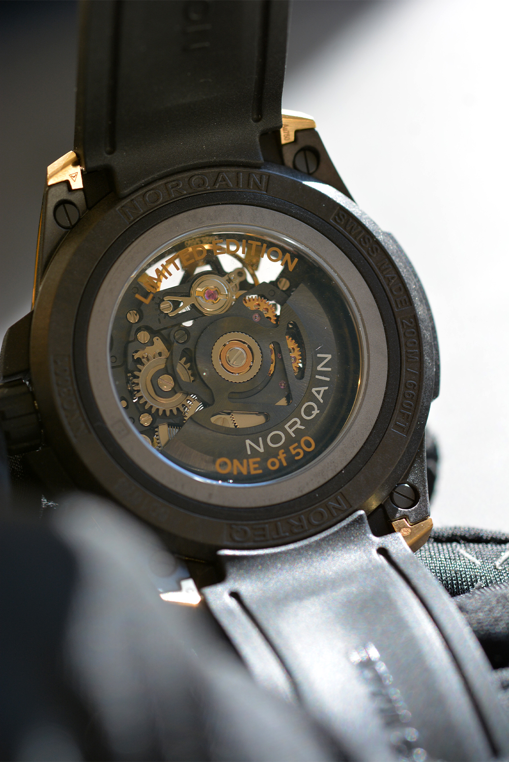 ケースサイドのノルケインプレートももちろんイエローゴールドを採用。ステンレス同様、刻印を入れることも可能となっております。(別途料金はかかります。)さらに裏側を覗くとLIMITED EDITION ONE of 50の文字が。どこから見ても特別感が満載です。スケルトンムーブメントの精密さやゴールドの色の風合いは、やはり実物でしか伝わらない魅力が詰まっています。