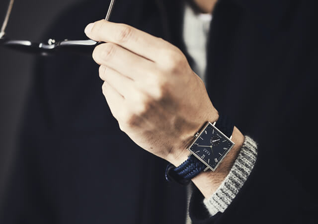 クラシックな雰囲気を持つスクエアモデルは、手元に知的で落ち着いた印象を与えてくれます。角型ケースでありながら主張は控えめで、スーツにも自然に調和。丸型とは異なる個性をさりげなく楽しめる一本です。