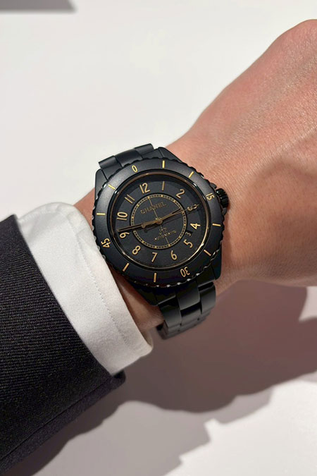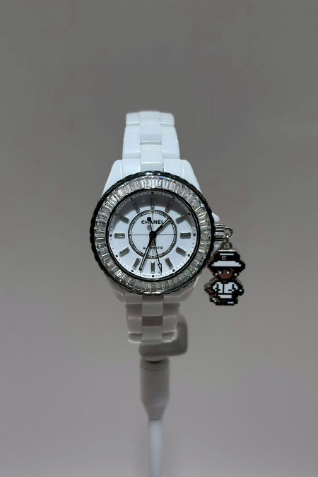 ピクセルアート調のマドモアゼルシャネルが、チャームになったり、秒針になったりと、ユニークで可愛らしいJ12は、手元で抜群の存在感を出してくれそうです。