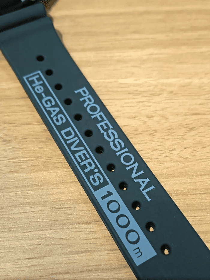 ストラップにも「ヘリウムガスを用いた飽和潜水が可能な1000m防水のプロダイバー」の表記。強化シリコン製で、劣化しにくく切れにくく、かつ肌馴染みも抜群です。