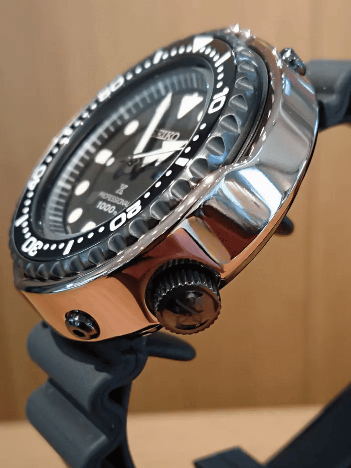 回転ベゼル部分の夜光が20分までしかないのは、光が届かないような深海ではここまでが人間の活動限界ということなのでしょう。