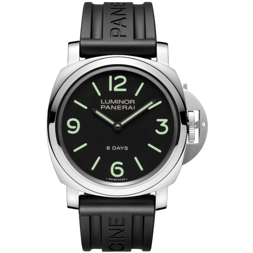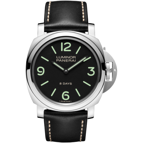 余計な装飾を取り去った「シンプルイズベスト」な人気モデルが再入荷してまいりました~。秒針もなく長・短針のみの文字盤はスッキリとしており、抜群の視認性を発揮します。内部にはパネライ自社製の手巻きキャリバーP.5000を搭載。8日間のパワーリザーブを備えます。