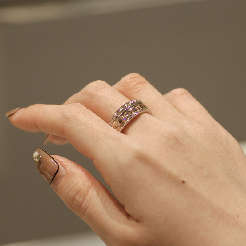 同色のブラウンダイヤモンドが連なる「ライン」と巧みに配された色調が美しい「メランジェ」。同じストレートラインを重ね付けすることで他にないエレガントさやボリュームが生まれ、まるで1本のリングのようにも見えます。