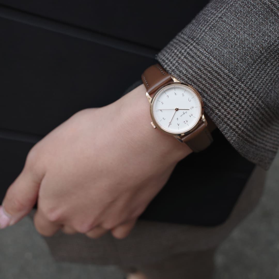 時計本体とストラップの組み合わせが自由に組み合わせられるカスタマイズウォッチのパイオニア「Knot」。使用している時計本体はプリべ石川とノットとのコラボレーションモデルです。シェル文字盤と6時位置の小さな秒針の枠にゴールドカラーを配した特別感のあるデザインに仕上げられています。ストラップは栃木レザーの明るめのブラウンを合わせております。時計本体:17,600円(税込)/ストラップ:4,400円(税込)/尾錠:550円(税込)
