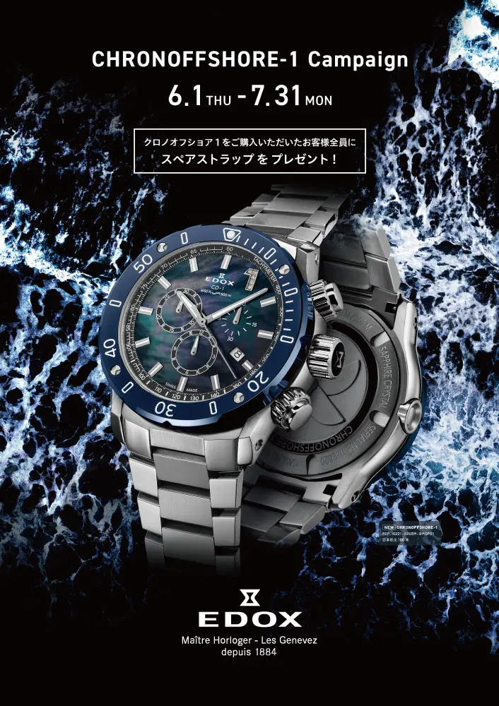 この夏、タフでスポーティな防水系の時計をご検討中の方に、エドックスより『クロノオフショア1 キャンペーン』のご案内です。
