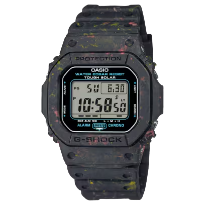 パーツの製造過程で出てくる廃棄樹脂を粉砕加工し、練り込んだ樹脂をベゼルやバンドに採用した環境に配慮したモデルが登場。ベースカラーのマットブラックに、G-SHOCKの定番カラーであるレッドとイエローの廃棄樹脂を混ぜ込み、独特のパターンを作り上げました。普段使いでも、ファッションシーンでも幅広く活用できるデザインです。こちらのモデルはタフソーラーを搭載。