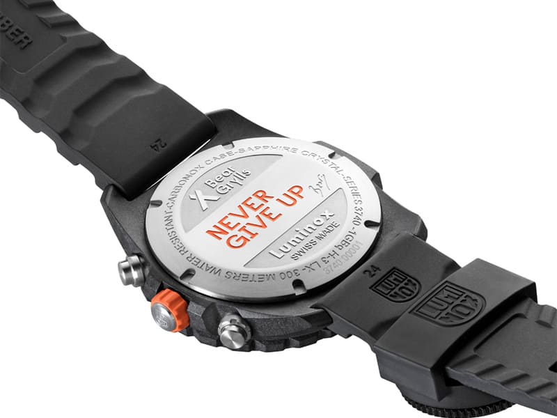 裏蓋には、【人生は高いところを目指すだけではなく、転んだ時に、何度でも立ち上がることができるかどうかだ。とにかくあきらめずに前進し続けること!】という、ベア氏の想いが刻印されています。