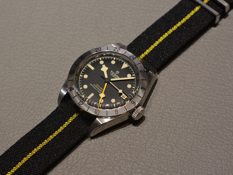 ブラックベイ プロに合わせるのは、老舗の職人によって生み出されたイエローのセンターライン入りのブラックファブリックストラップです。
