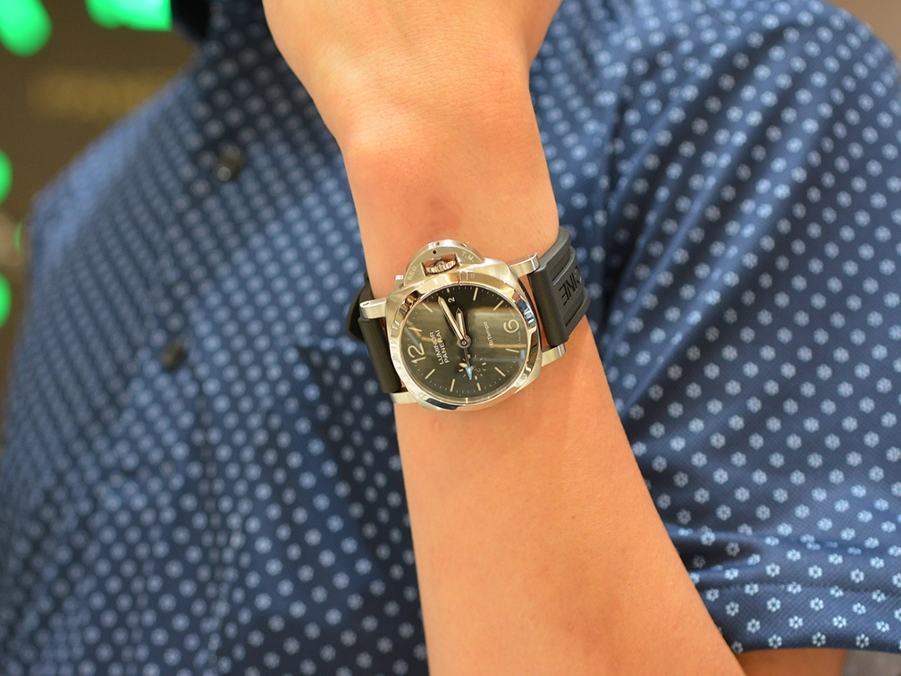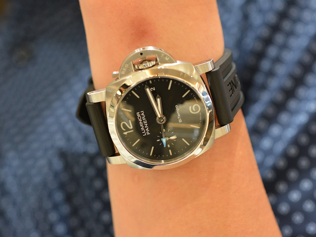 パネライの定番ルミノールにGMT機能が搭載されたルミノール クアランタ BiTempo。ホワイトのインデックスはダイヤルとのコントラストを明確にし、ミニッツトラックと共にキリッとした印象です。スモールセコンドは針と同じシルバーに統一され、GMT針の水色は爽やかさと存在感を与えます。もちろん付属しているラバーベルトはワンタッチで交換可能でオールシーズン活躍すること間違いなしです。ご購入いただいたT様はさっそくラバーベルトに取り換えて腕にのせられておりました。