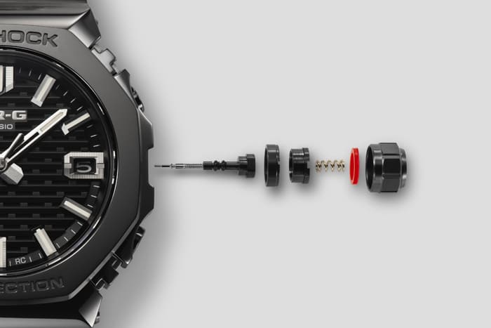 MR-Gシリーズではお馴染みとなったりゅうずの耐衝撃構造も、MRG-B2100のケースの薄型化に合わせて小型化されています。ねじ込み式のりゅうずは、ロック時にMR-Gの刻印が水平をキープする特殊な構造を採用しています。
