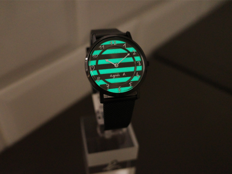 暗がりでほんのりと光る蓄光塗料を施したボーダーダイヤルは、日常に小さなサプライズと楽しみをもたらします。手書きフォントのインデックスが加わることで、一層個性的で心温まるアクセサリーに仕上がっています。