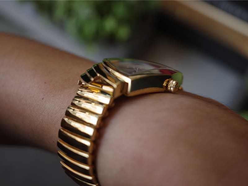腕に着けると、ガラス風防からケース、特徴的な蛇腹のステンレスブレスまで滑らかに曲線を描きフィットしているのが分かります。
