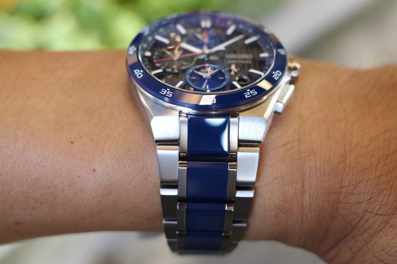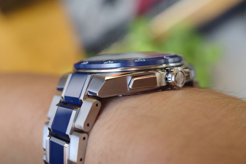 ロサンゼルス・ドジャースのチームカラーでもあるブルーを、美しさと強さのあるセラミックス素材でベゼルとブレス中ゴマに使用。ポイントに赤色も随所に用いられています。他モデルにはない、スポーティで存在感のある雰囲気が特徴的です。