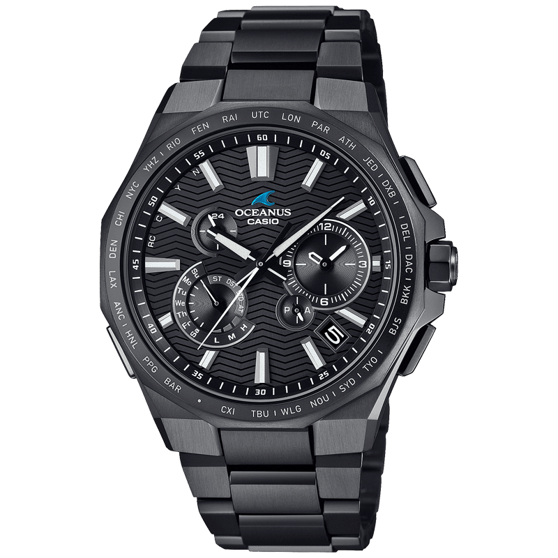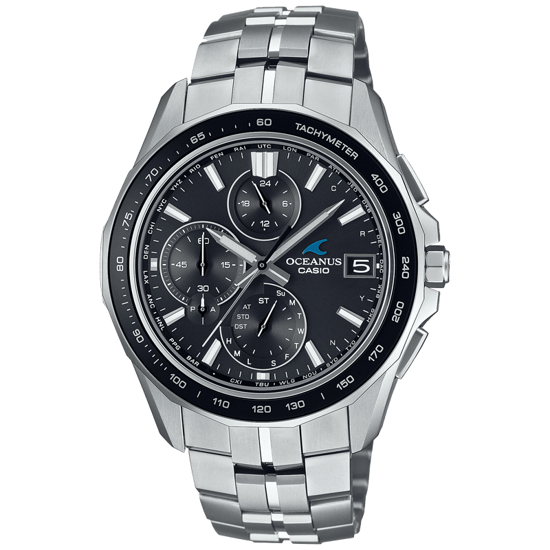 統一感のあるブラックのベゼルとダイアルが視認性を確保し、タキメーター表示のベゼルには傷に強く透明感の高いサファイアガラスを採用。OCEANUS Mantaならではの上質さを際立たせています。