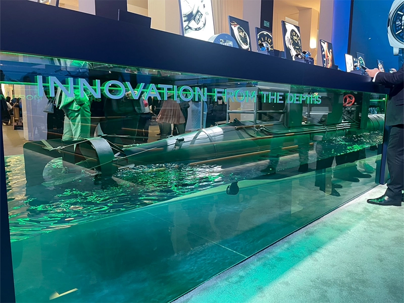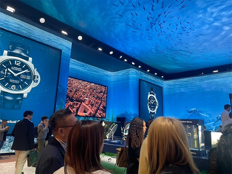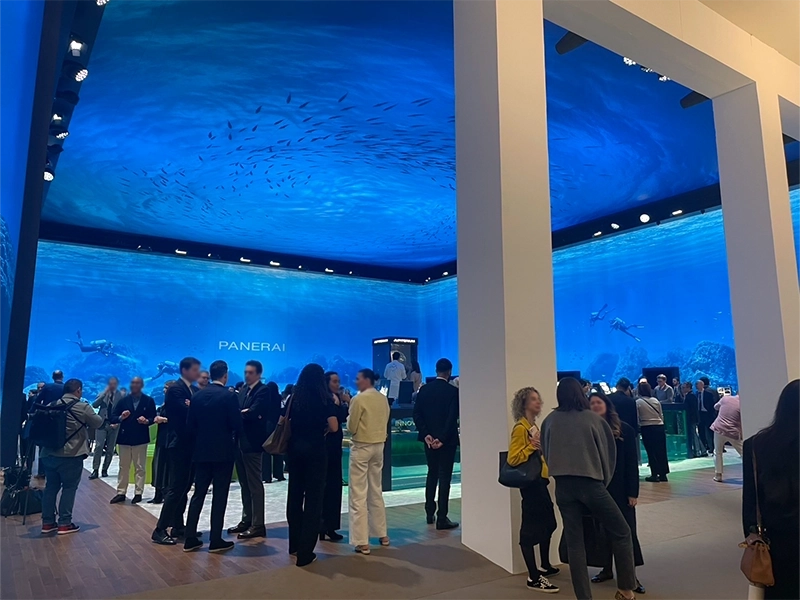 「海から生まれた時計」パネライのブースは、さながら海中にいるかのような設えです。