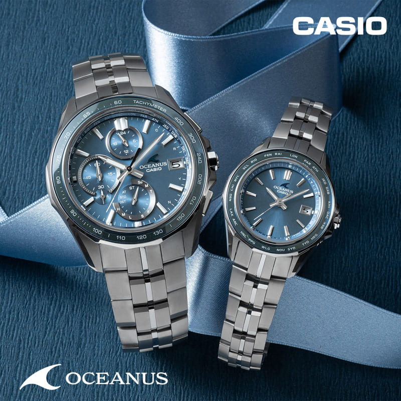 【テクノロジー × エレガンス】がコンセプトのオシアナスから、フラッグシップモデル『マンタ』のペアウオッチが登場。クールなライトブルーとブラウンがラインナップ。記念の品としておすすめです。