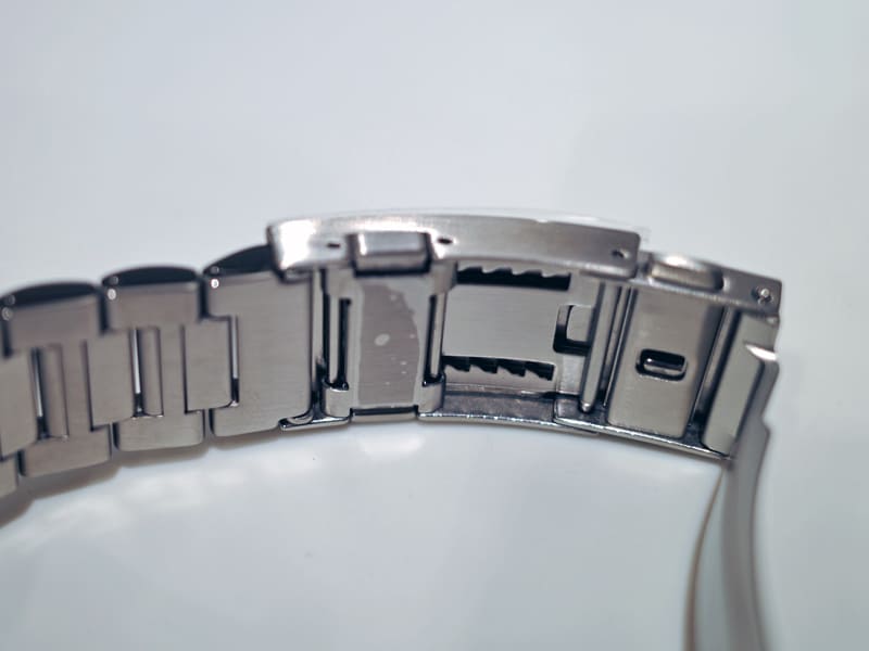 こちらがバックルの機構の部分です。ラチェット式になっており、SEIKOでは『ワンプッシュダイバーアジャスター方式』と名付けているようですが、ワンアクションで最大約15mmの調整幅があり、約2.5mmずつ、6段階で調整を行うことができます。意外とコマを外すのと変わらない調整幅のブランドもある中、意味のある造りとなっています。