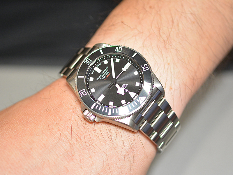 ケース・ブレスレットともにチタニウム製で軽量感を誇る、本格ダイバーズウォッチ。