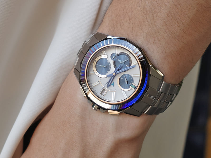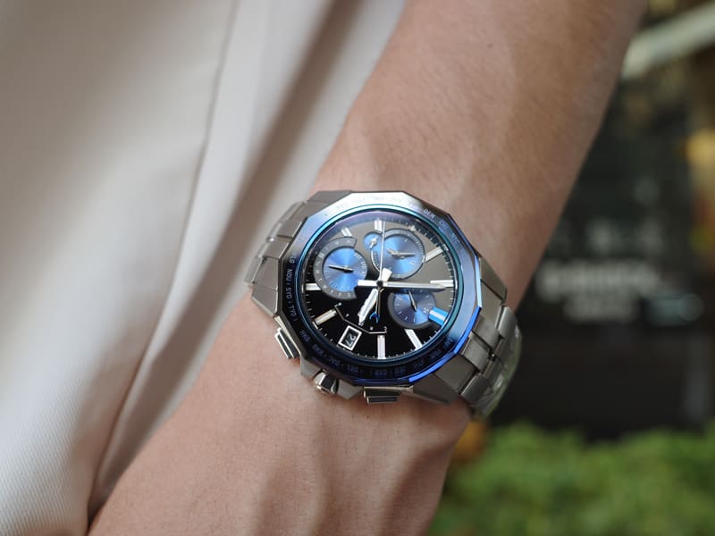 光が入ると奥行きのあるブルーが目を楽しませてくれる、オシアナスのフラグシップモデル。青の色味が一段と濃く深い。