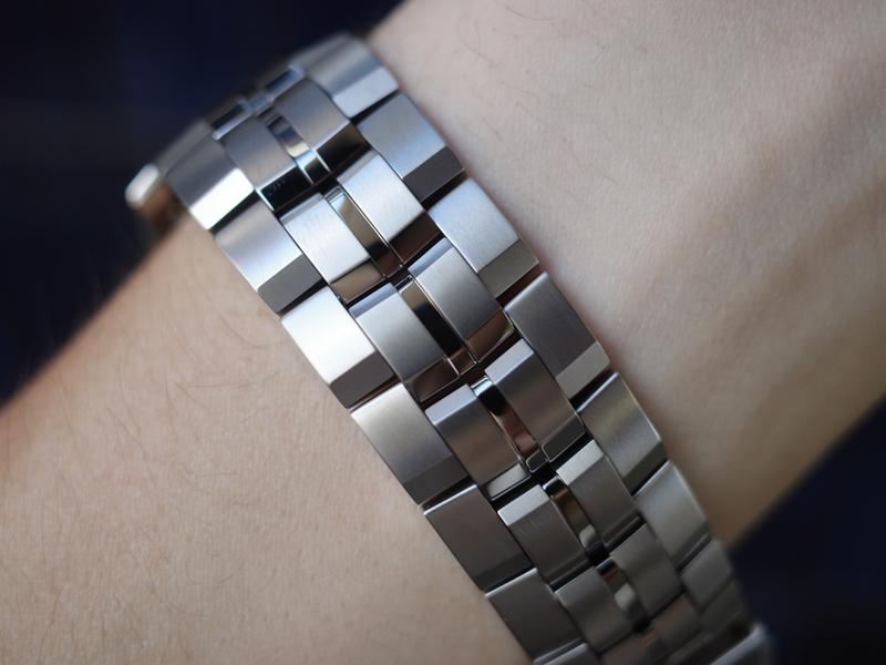 細かく仕上げ分けされたチタン無垢バンドは、矢羽根型のH駒と鏡面ライン入りの中駒で構成。中留に、工具を使わずバンドの長さを微調整できるスライドアジャスト機構を採用しています。時計そのものの質感をより一際高めてくれます。