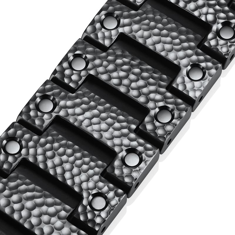 最大の特徴は、日本の伝統金工技術「鎚起(ついき)」をベゼルとバンド全面に施していること。