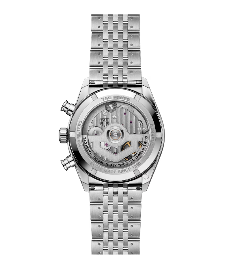 コラムホイールと垂直クラッチを備えたキャリバーTH20-01が、滑らかで信頼性の高いクロノグラフ操作を実現。両方向巻き上げ機構が安定した動力供給を強化し、100mの防水性と5年保証が永続的な安心感をもたらします。