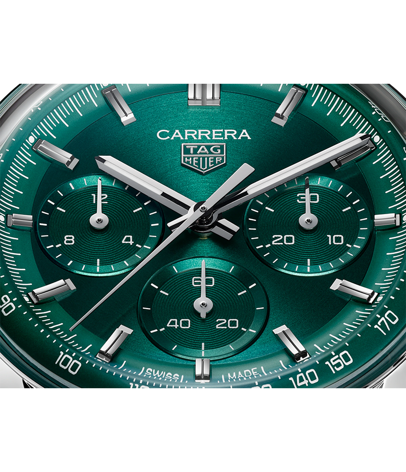 シグネチャーのグラスボックス サファイアクリスタルの下で明瞭さと奥行き感を際立たせる、同系色でまとめられたトリコンパックスのレイアウト。アジュラージュ加工のサブカウンター、タキメータースケールを備えたグリーンのフランジ、ホワイトのスーパールミノバ® を塗布したロジウムプレートの針が、どの角度から見ても申し分のない視認性をもたらします。