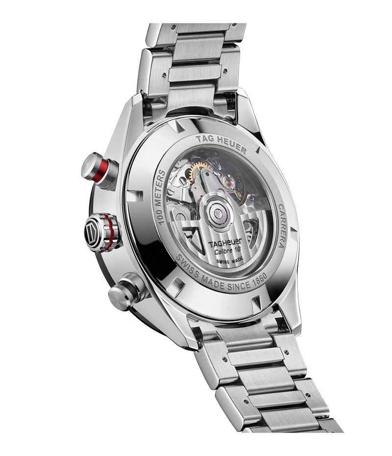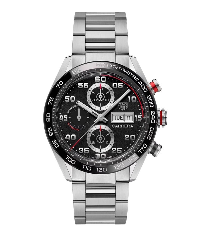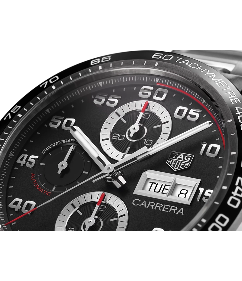 このタグ・ホイヤー カレラのブラックのダイヤルは、スポーティなレッドのタッチ、そして象徴的な新しいフォントの数字とテキストを配し、その存在感を主張しています。