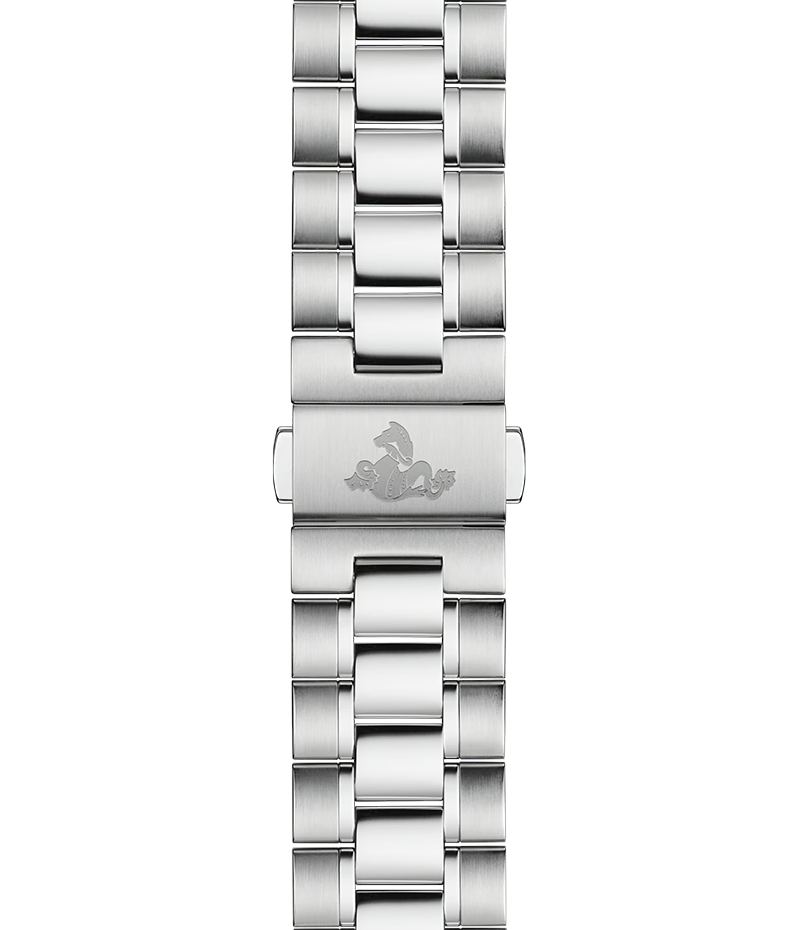 このモデルの特徴は、ステンレススチール製ケースと、ブラックのアルミニウム製リングにタキメータースケールを搭載したベゼルです。