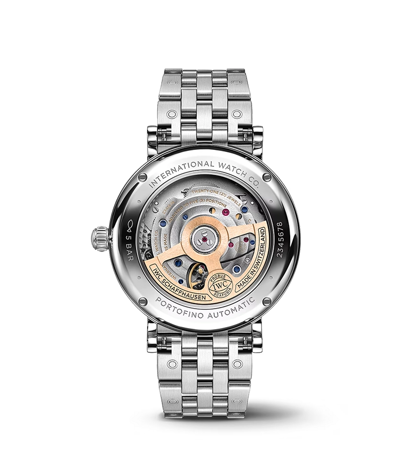 ケース内部では、双方向爪巻上げ機構を組み込んだIWC自社製「キャリバー32111」が鼓動を刻み、120時間のパワーリザーブを蓄えます。サファイアガラスのシースルー裏蓋を通して、ゴールドコーティングを施したローターとブルーススチール製ビスを持つムーブメントを鑑賞できます。