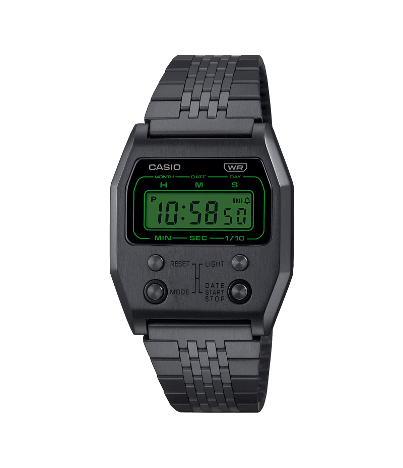 ヘアラインとミラーで丁寧に磨き分けされたケース、メタル素材のアイコニックなフロントボタンで上質に仕上げました。さりげなく刻まれた機能表示も質感を高めるポイントです。また、表面をフラットに仕上げた多列タイプのバンドを採用し、レトロなデザインと腕への着け心地を両立しました。