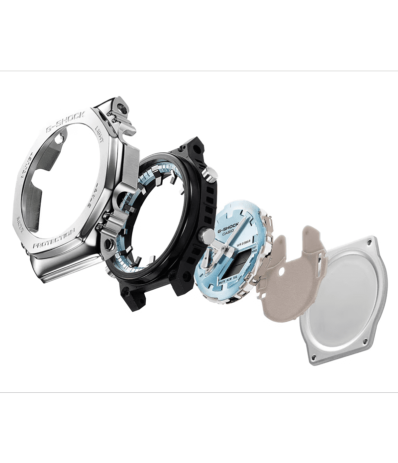 均一な八角形成形による金属製ベゼルや高剛性を発揮するガラス繊維入りファインレジン素材のケースを採用。タフな構造とシンプルなデザインはそのままに、11.8mmという薄さを実現しました。メタルバンド仕様でビジネスシーンにも対応できます。