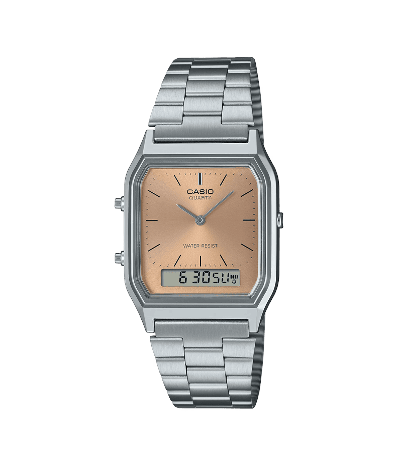 ベースモデルは角型フェイスにアナログ時計とデジタル表示を組み合わせた人気のAQ-230。旭光文字板に、サーモンピンクを採用したクラシカルなデザインです。