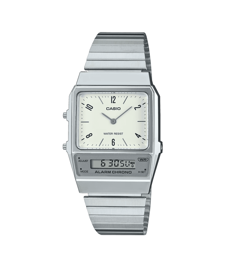 角型フォルムのケースと横長の駒形状を採用したメタルバンドを組み合わせることで、スタイリッシュな外観に。ストップウオッチ、アラーム、デュアルタイム等、日常生活に便利な機能も備えています。