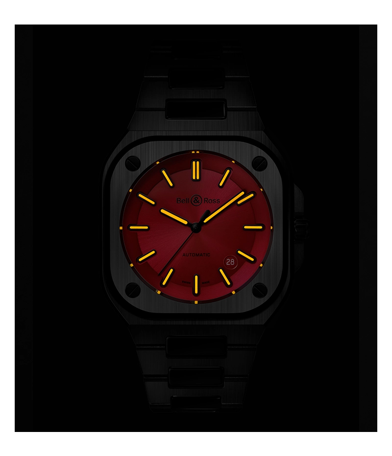 自動巻ムーブメント「BR-CAL.321-1」を搭載したBR-05 レッドブラック セラミックは、54時間のパワーリザーブを誇ります。 針とインデックスにはオレンジのスーパールミノバ®が塗布され、視認性を最大限に高めています。テクニカルなコントラストと美しさの調和は、Bell & Rossを象徴するデザインコードを体現しています。