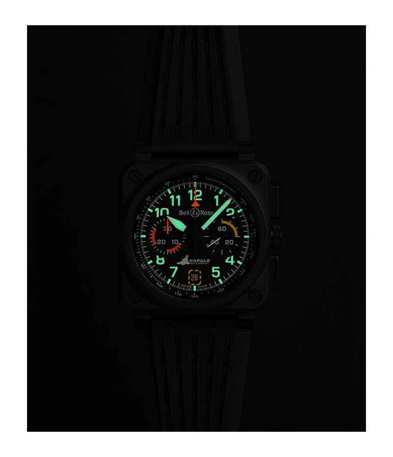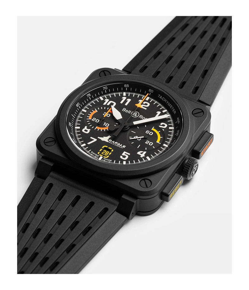 ラファール・ソロ・ディスプレイの極限的な条件に合わせて設計された BR-03 は、堅牢性、精度、即時の読み取りやすさを兼ね備えたクロノグラフです。文字盤にはラファール戦闘機のシルエットと、日付表示窓の黄色い点線やオレンジ色のクロノグラフ針などといったコックピットから着想を得たグラフィック要素が採用されています。